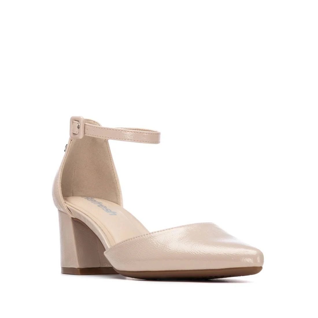 Scarpa aperta di Refresh. Realizzata in un materiale simile alla pelle con finitura verniciata. Presenta una punta affusolata e un sottile cinturino regolabile con fibbia laterale. Il suo design elegante e minimalista la rende la scelta perfetta sia per look formali che casual. Comoda e versatile, è ideale per il lavoro, gli eventi o per un look casual di tutti i giorni grazie al tacco a blocco. Questo modello ha ottenuto la certificazione vegana da PETA (l’organizzazione globale per i diritti degli animali).